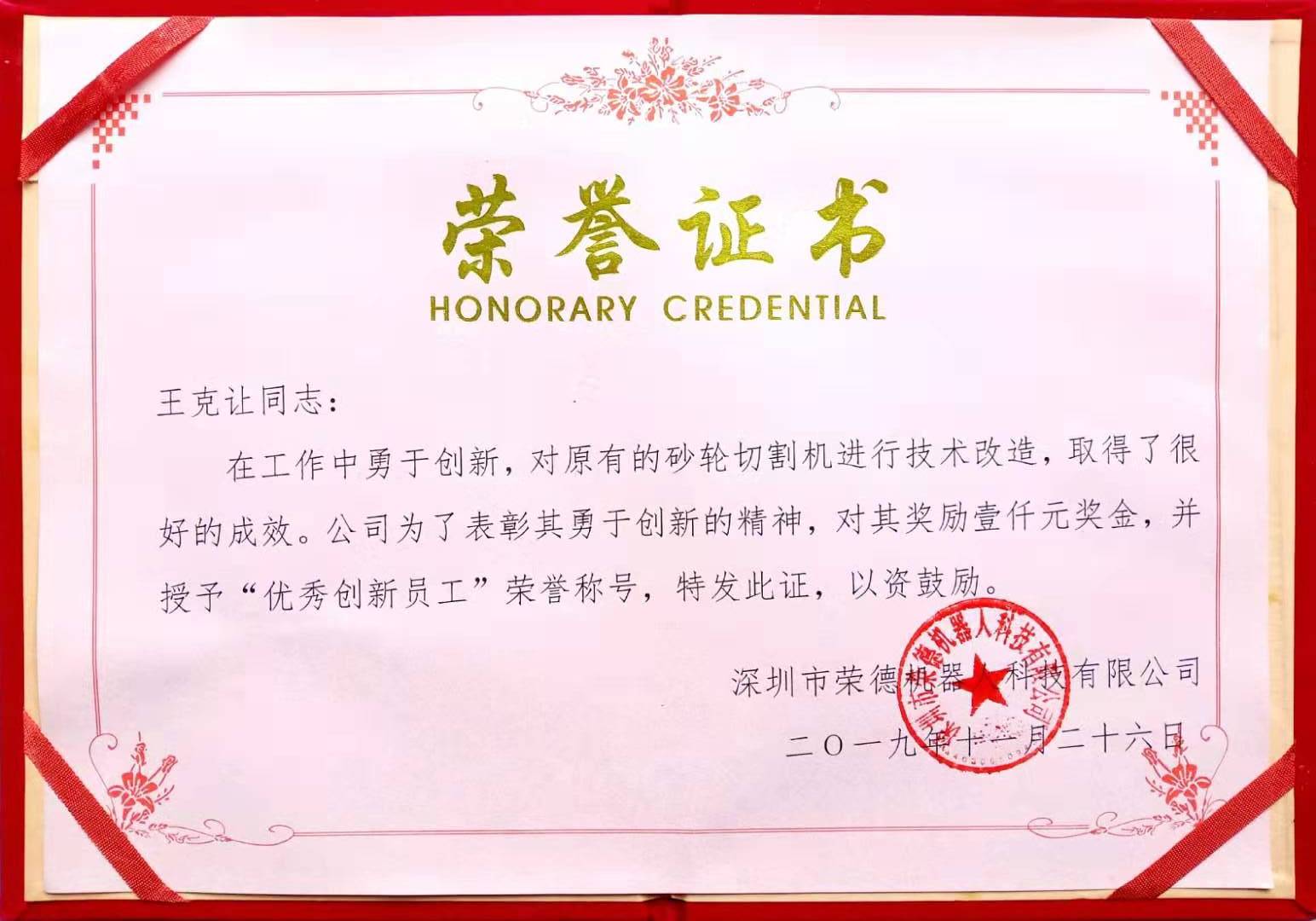 2019年,王克讓對原有的砂輪切割機(jī)進(jìn)行技術(shù)改造,取得了很好的成效,公司對此創(chuàng)新精神給予1000元的獎勵