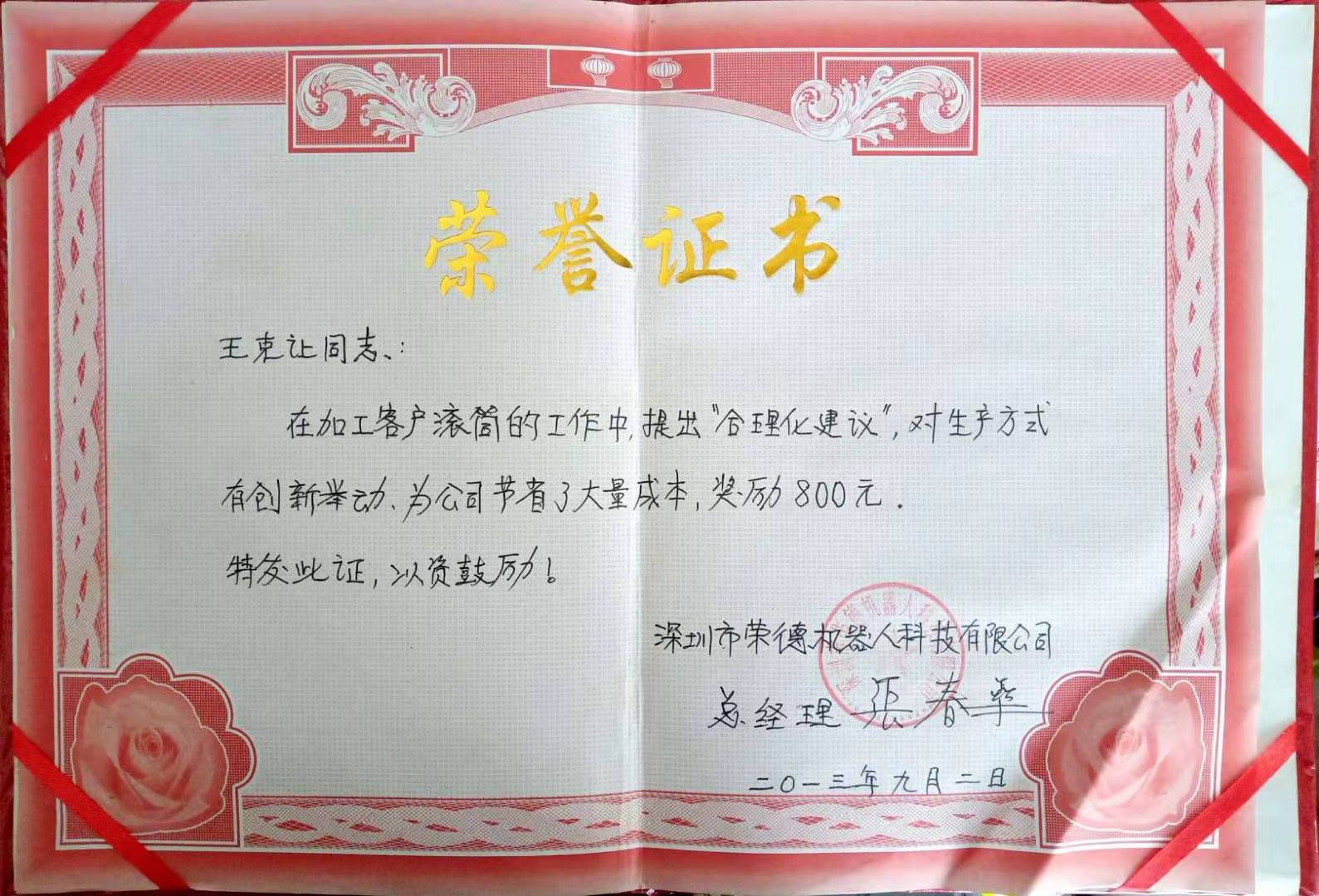 2013年,在為客戶加工滾筒的工作中提出了合理化建議,公司給予800元的獎勵。