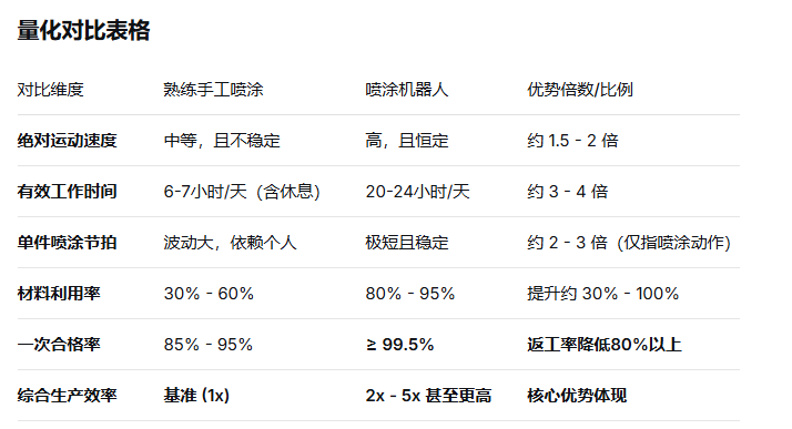 手工噴涂: 工人的手臂移動(dòng)速度有限,且不穩(wěn)定。需要休息、喝水、上廁所,無(wú)法持續(xù)高速作業(yè)。噴涂節(jié)奏會(huì)因疲勞而逐漸減慢。
